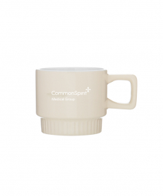 11 oz stackable ceramic mug with glossy colored exterior, glossy white interior, and textured base.
