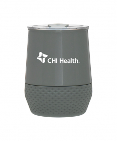12 oz double wall 18/8 stainless steel thermal tumbler with copper vacuum insulation, push-on lid, matching swivel closure, and removable silicone base.