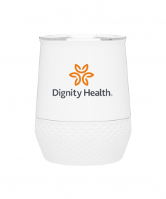12 oz double wall 18/8 stainless steel thermal tumbler with copper vacuum insulation, push-on lid, matching swivel closure, and removable silicone base.