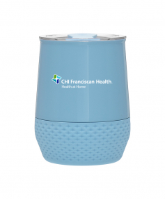 12 oz double wall 18/8 stainless steel thermal tumbler with copper vacuum insulation, push-on lid, matching swivel closure, and removable silicone base.