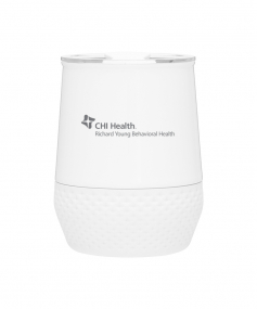 12 oz double wall 18/8 stainless steel thermal tumbler with copper vacuum insulation, push-on lid, matching swivel closure, and removable silicone base.