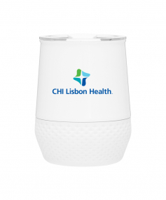 12 oz double wall 18/8 stainless steel thermal tumbler with copper vacuum insulation, push-on lid, matching swivel closure, and removable silicone base.