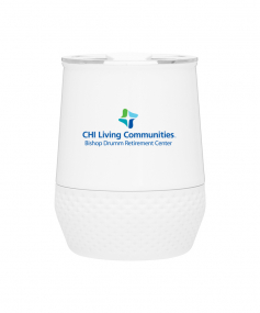 12 oz double wall 18/8 stainless steel thermal tumbler with copper vacuum insulation, push-on lid, matching swivel closure, and removable silicone base.
