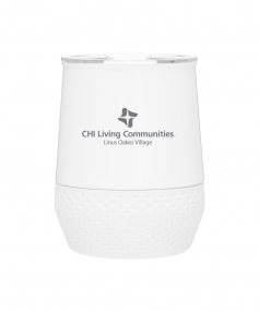 12 oz double wall 18/8 stainless steel thermal tumbler with copper vacuum insulation, push-on lid, matching swivel closure, and removable silicone base.