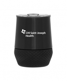 12 oz double wall 18/8 stainless steel thermal tumbler with copper vacuum insulation, push-on lid, matching swivel closure, and removable silicone base.