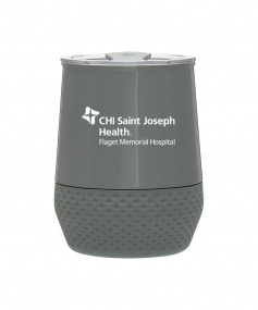 12 oz double wall 18/8 stainless steel thermal tumbler with copper vacuum insulation, push-on lid, matching swivel closure, and removable silicone base.
