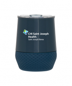 12 oz double wall 18/8 stainless steel thermal tumbler with copper vacuum insulation, push-on lid, matching swivel closure, and removable silicone base.