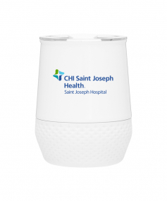12 oz double wall 18/8 stainless steel thermal tumbler with copper vacuum insulation, push-on lid, matching swivel closure, and removable silicone base.