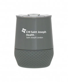 12 oz double wall 18/8 stainless steel thermal tumbler with copper vacuum insulation, push-on lid, matching swivel closure, and removable silicone base.