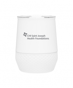 12 oz double wall 18/8 stainless steel thermal tumbler with copper vacuum insulation, push-on lid, matching swivel closure, and removable silicone base.