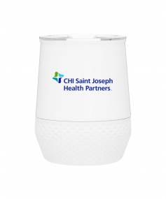 12 oz double wall 18/8 stainless steel thermal tumbler with copper vacuum insulation, push-on lid, matching swivel closure, and removable silicone base.
