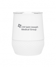 12 oz double wall 18/8 stainless steel thermal tumbler with copper vacuum insulation, push-on lid, matching swivel closure, and removable silicone base.