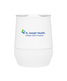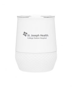 12 oz double wall 18/8 stainless steel thermal tumbler with copper vacuum insulation, push-on lid, matching swivel closure, and removable silicone base.