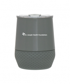 12 oz double wall 18/8 stainless steel thermal tumbler with copper vacuum insulation, push-on lid, matching swivel closure, and removable silicone base.