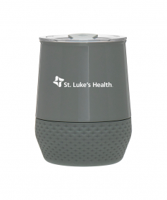 12 oz double wall 18/8 stainless steel thermal tumbler with copper vacuum insulation, push-on lid, matching swivel closure, and removable silicone base.