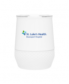 12 oz double wall 18/8 stainless steel thermal tumbler with copper vacuum insulation, push-on lid, matching swivel closure, and removable silicone base.