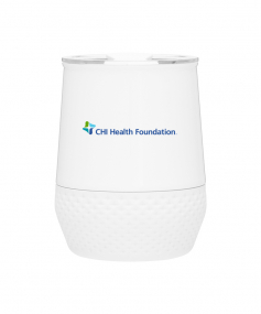 12 oz double wall 18/8 stainless steel thermal tumbler with copper vacuum insulation, push-on lid, matching swivel closure, and removable silicone base.