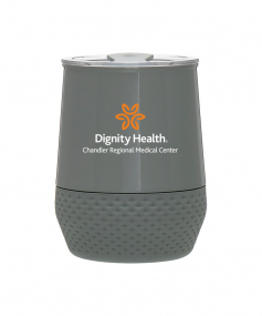 12 oz double wall 18/8 stainless steel thermal tumbler with copper vacuum insulation, push-on lid, matching swivel closure, and removable silicone base.