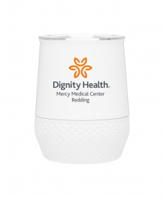 12 oz double wall 18/8 stainless steel thermal tumbler with copper vacuum insulation, push-on lid, matching swivel closure, and removable silicone base.