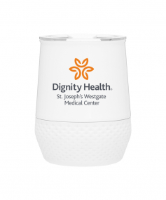 12 oz double wall 18/8 stainless steel thermal tumbler with copper vacuum insulation, push-on lid, matching swivel closure, and removable silicone base.