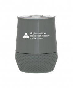 12 oz double wall 18/8 stainless steel thermal tumbler with copper vacuum insulation, push-on lid, matching swivel closure, and removable silicone base.