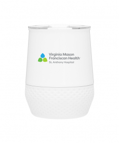 12 oz double wall 18/8 stainless steel thermal tumbler with copper vacuum insulation, push-on lid, matching swivel closure, and removable silicone base.