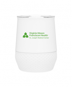 12 oz double wall 18/8 stainless steel thermal tumbler with copper vacuum insulation, push-on lid, matching swivel closure, and removable silicone base.