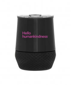 12 oz double wall 18/8 stainless steel thermal tumbler with copper vacuum insulation, push-on lid, matching swivel closure, and removable silicone base.