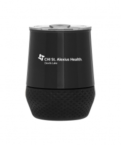 12 oz double wall 18/8 stainless steel thermal tumbler with copper vacuum insulation, push-on lid, matching swivel closure, and removable silicone base.