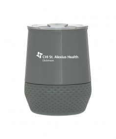 12 oz double wall 18/8 stainless steel thermal tumbler with copper vacuum insulation, push-on lid, matching swivel closure, and removable silicone base.