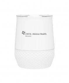 12 oz double wall 18/8 stainless steel thermal tumbler with copper vacuum insulation, push-on lid, matching swivel closure, and removable silicone base.