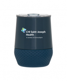 12 oz double wall 18/8 stainless steel thermal tumbler with copper vacuum insulation, push-on lid, matching swivel closure, and removable silicone base.
