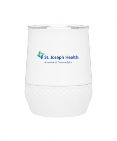 12 oz double wall 18/8 stainless steel thermal tumbler with copper vacuum insulation, push-on lid, matching swivel closure, and removable silicone base.
