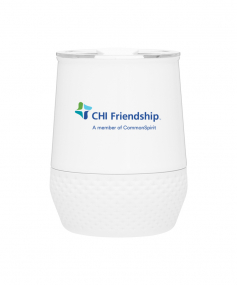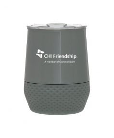 12 oz double wall 18/8 stainless steel thermal tumbler with copper vacuum insulation, push-on lid, matching swivel closure, and removable silicone base.