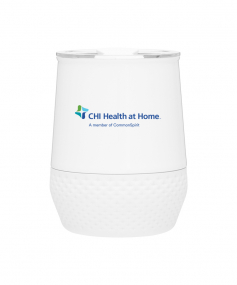 12 oz double wall 18/8 stainless steel thermal tumbler with copper vacuum insulation, push-on lid, matching swivel closure, and removable silicone base.
