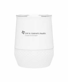 12 oz double wall 18/8 stainless steel thermal tumbler with copper vacuum insulation, push-on lid, matching swivel closure, and removable silicone base.