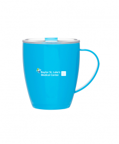 12 oz double wall 18/8 stainless steel thermal mug with copper vacuum insulation, clear acrylic push-on lid, and matching swivel; Hand wash recommended; Do not microwave; 4-7/16" h x 4"w (4-7/8 with handle) ; 355mL.