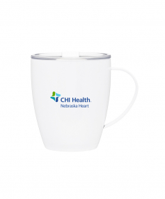 12 oz double wall 18/8 stainless steel thermal mug with copper vacuum insulation, clear acrylic push-on lid, and matching swivel; Hand wash recommended; Do not microwave; 4-7/16" h x 4"w (4-7/8 with handle) ; 355mL.