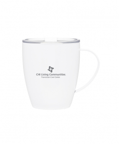 12 oz double wall 18/8 stainless steel thermal mug with copper vacuum insulation, clear acrylic push-on lid, and matching swivel; Hand wash recommended; Do not microwave; 4-7/16" h x 4"w (4-7/8 with handle) ; 355mL.