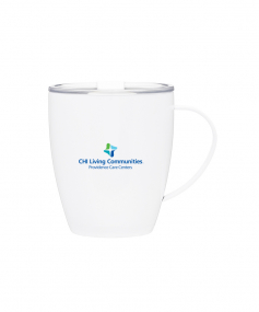 12 oz double wall 18/8 stainless steel thermal mug with copper vacuum insulation, clear acrylic push-on lid, and matching swivel; Hand wash recommended; Do not microwave; 4-7/16" h x 4"w (4-7/8 with handle) ; 355mL.