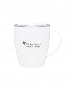 12 oz double wall 18/8 stainless steel thermal mug with copper vacuum insulation, clear acrylic push-on lid, and matching swivel; Hand wash recommended; Do not microwave; 4-7/16" h x 4"w (4-7/8 with handle) ; 355mL.