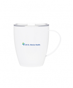 12 oz double wall 18/8 stainless steel thermal mug with copper vacuum insulation, clear acrylic push-on lid, and matching swivel; Hand wash recommended; Do not microwave; 4-7/16" h x 4"w (4-7/8 with handle) ; 355mL.