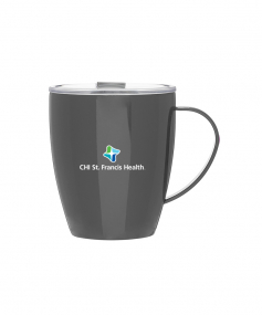 12 oz double wall 18/8 stainless steel thermal mug with copper vacuum insulation, clear acrylic push-on lid, and matching swivel; Hand wash recommended; Do not microwave; 4-7/16" h x 4"w (4-7/8 with handle) ; 355mL.