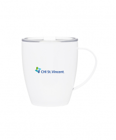 12 oz double wall 18/8 stainless steel thermal mug with copper vacuum insulation, clear acrylic push-on lid, and matching swivel; Hand wash recommended; Do not microwave; 4-7/16" h x 4"w (4-7/8 with handle) ; 355mL.