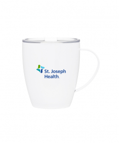 12 oz double wall 18/8 stainless steel thermal mug with copper vacuum insulation, clear acrylic push-on lid, and matching swivel; Hand wash recommended; Do not microwave; 4-7/16" h x 4"w (4-7/8 with handle) ; 355mL.