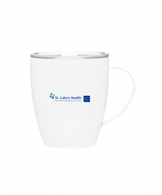 12 oz double wall 18/8 stainless steel thermal mug with copper vacuum insulation, clear acrylic push-on lid, and matching swivel; Hand wash recommended; Do not microwave; 4-7/16" h x 4"w (4-7/8 with handle) ; 355mL.
