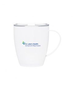 12 oz double wall 18/8 stainless steel thermal mug with copper vacuum insulation, clear acrylic push-on lid, and matching swivel; Hand wash recommended; Do not microwave; 4-7/16" h x 4"w (4-7/8 with handle) ; 355mL.