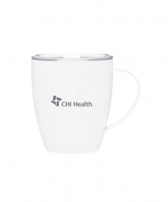 12 oz double wall 18/8 stainless steel thermal mug with copper vacuum insulation, clear acrylic push-on lid, and matching swivel; Hand wash recommended; Do not microwave; 4-7/16" h x 4"w (4-7/8 with handle) ; 355mL.