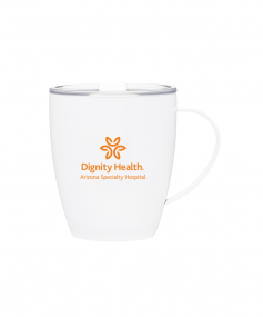 12 oz double wall 18/8 stainless steel thermal mug with copper vacuum insulation, clear acrylic push-on lid, and matching swivel; Hand wash recommended; Do not microwave; 4-7/16" h x 4"w (4-7/8 with handle) ; 355mL.