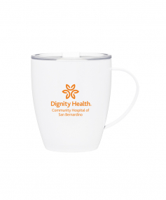 12 oz double wall 18/8 stainless steel thermal mug with copper vacuum insulation, clear acrylic push-on lid, and matching swivel; Hand wash recommended; Do not microwave; 4-7/16" h x 4"w (4-7/8 with handle) ; 355mL.